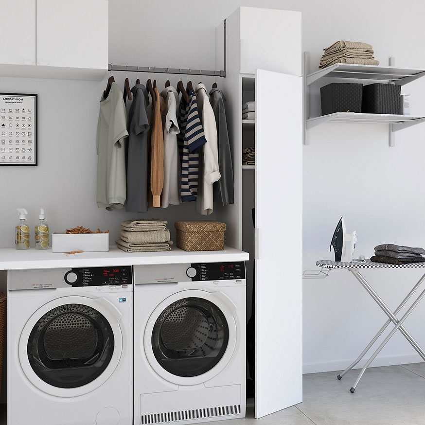 Pour libérer de la surface au sol, installez des étagères murales ou une colonne modulable, ou encore un meuble buanderie. Ils permettront de ranger sans encombrer et de tout garder à portée de main. Glissez aussi un meuble fin à roulettes entre le lave-linge et le mur pour stocker les produits d'entretien : pratique et discret !