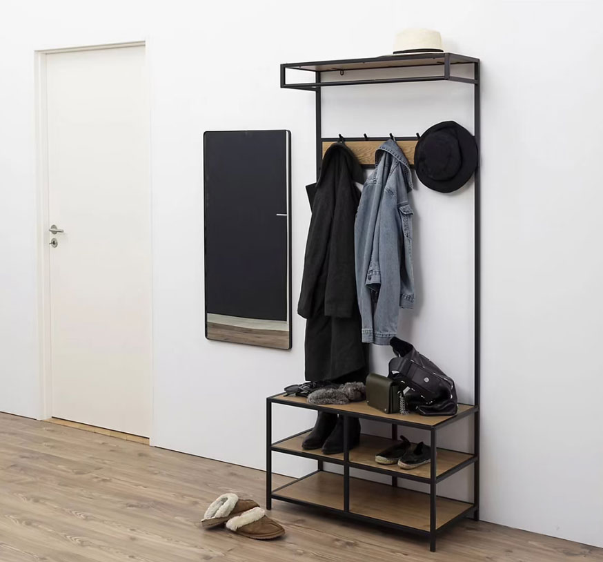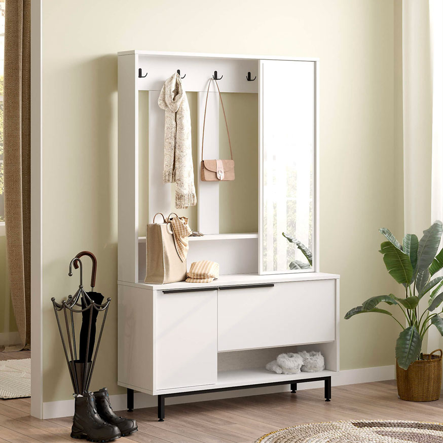 Pour ceux qui disposent d'un peu plus d'espace, une armoire d'entrée compacte est la solution tout-en-un : penderie pour les manteaux, étagères pour les chaussures, miroir intégré.