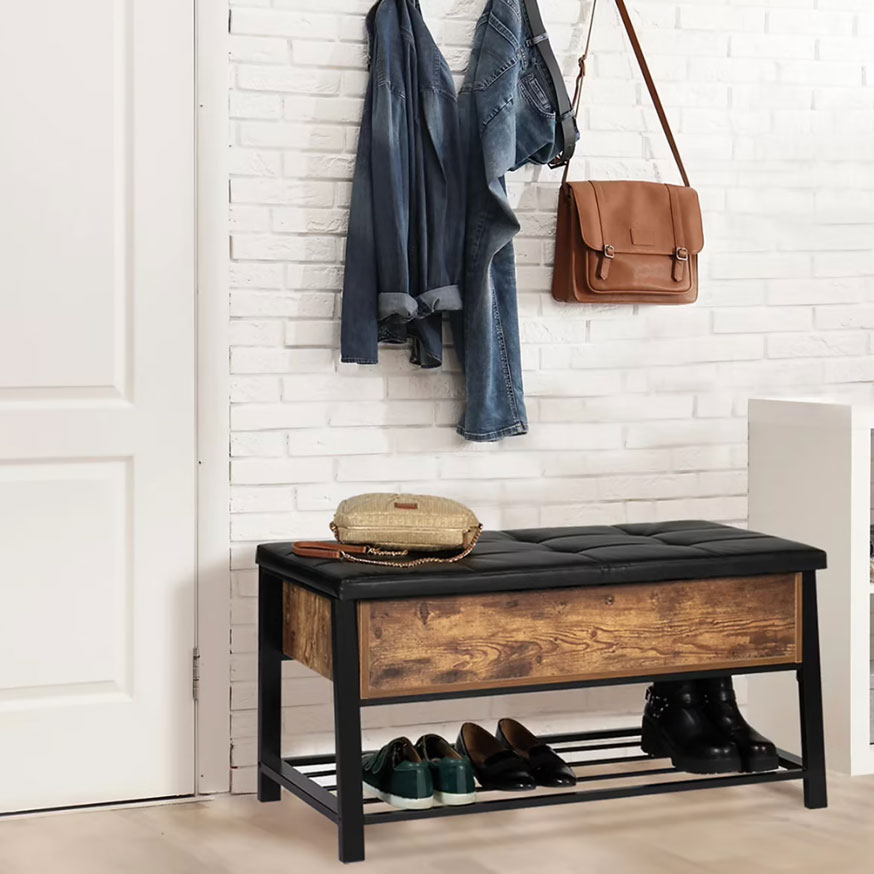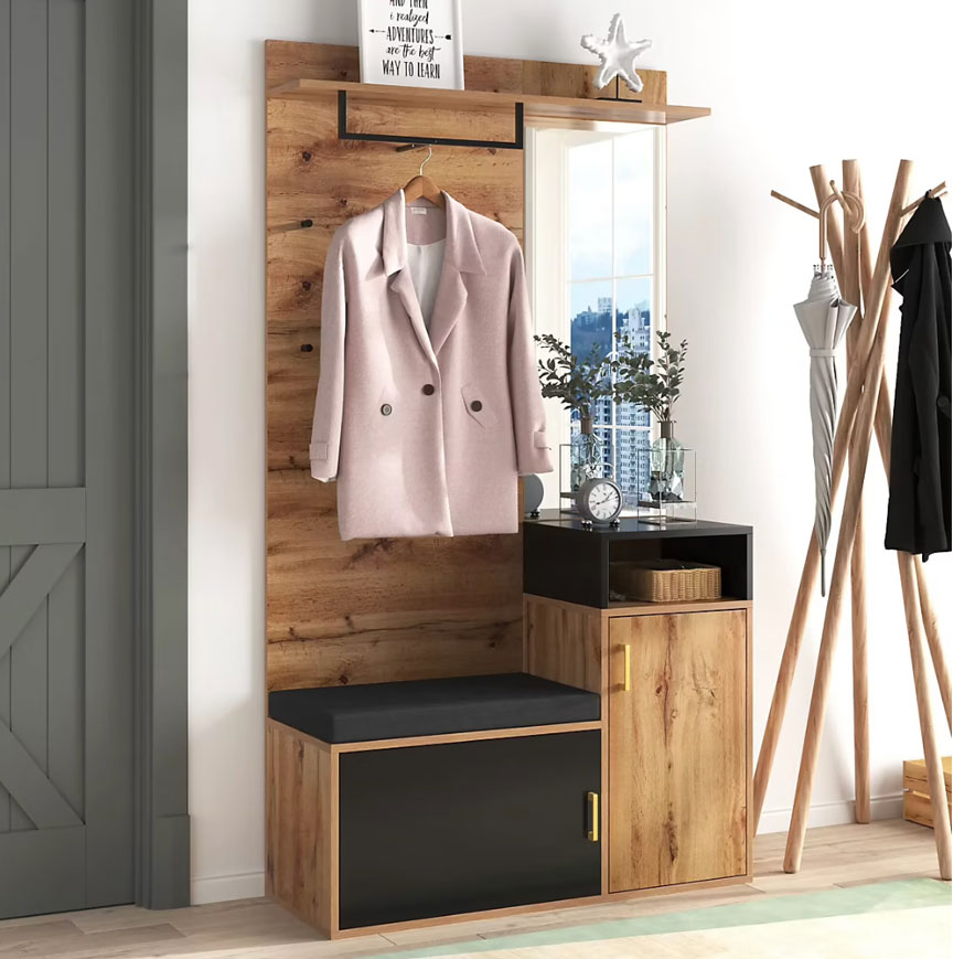 - Pour une entrée moyenne : associez un banc-coffre à un porte-manteau mural et un meuble à chaussures.