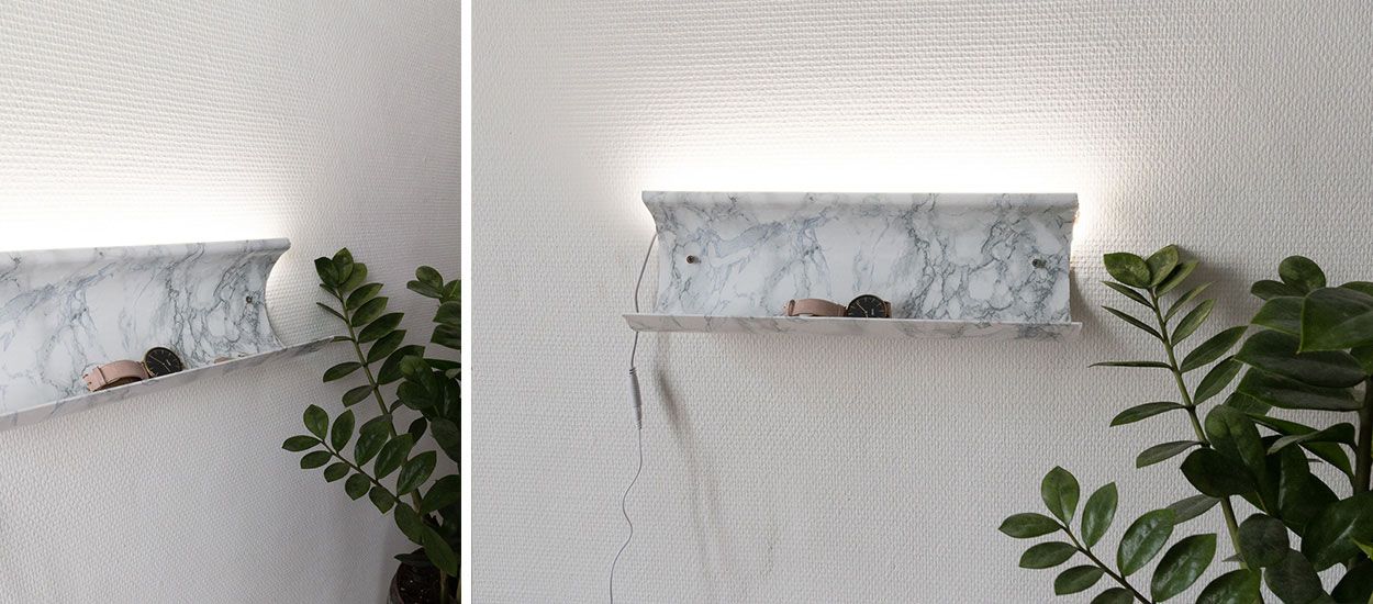 9 - Il ne reste plus qu'à fixer le vide-poche au mur avec deux vis dans les trous prévus à cet effet. Choisir des vis et chevilles adaptées à son mur. Puis, raccorder le ruban led à l'alimentation fournie.