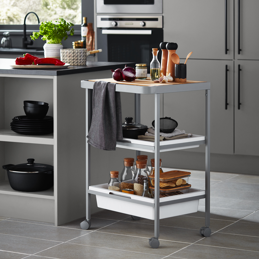 Toujours du côté cuisine, si vous avez un petit plan de travail, ce n'est pas très agréable ni pratique pour cuisiner... La desserte GoodHome Budu. Elle vous permettra d'avoir un espace supplémentaire pour cuisiner grâce à sa planche à découper amovible ainsi que 2 plateaux en plastique. Elle peut se déplacer facilement avec ses 4 roues pour que vous puissiez l'installer et la ranger à l'endroit de votre convenance, en fonction de vos besoins.