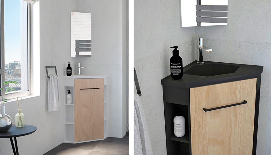 La gamme Nova propose des meubles de salle de bains compacts et fonctionnels, idéaux pour les petits espaces. Les modèles, comme le meuble d'angle tout-en-un ou le meuble rectangulaire, sont disponibles en finitions noir mat ou blanc mat avec une porte décor bois, offrant une esthétique moderne et épurée. Ces meubles sont conçus pour maximiser l'espace tout en offrant des solutions de rangement efficaces.
