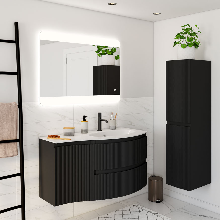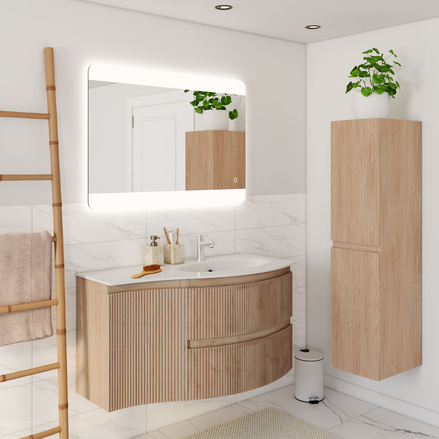 La gamme Vague est idéale pour les petites salles de bains grâce à ses lignes courbes qui allègent visuellement l'espace. Compacte et modulable, elle propose des meubles sous-vasque individuels ou combinables, avec plan à encastrer ou vasque à poser, et plusieurs finitions (mat, brillant, bois, strié). Ses rangements pratiques à fermeture silencieuse et ses compléments suspendus (colonnes, miroirs, armoires) permettent d'optimiser la hauteur tout en gardant une ambiance aérée.