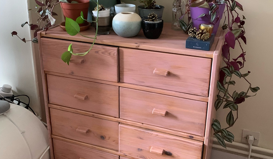 "Ce meuble tout simple avait été laissé là par les anciens locataires, le propriétaire de l'appartement nous a dit à notre arrivée qu'on pouvait le garder et en faire ce qu'on voulait. Du coup, on a décidé de le customiser ! Un peu de ponçage et un vernis vieux rose plus tard, il a retrouvé une seconde vie et s'est parfaitement intégré à notre déco. Pendant notre déménagement, on a dû s'en séparer. Nous l'avons mis en vente sur Leboncoin et l'avons vendu en un temps record !"