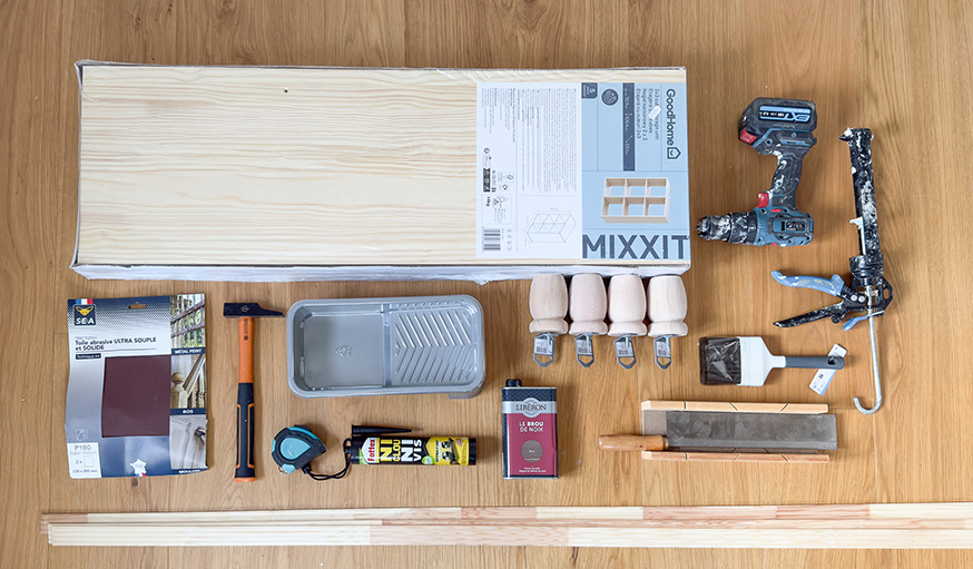 - 1 plateau en pin de 108x35cm à faire découper en magasin dans une tablette