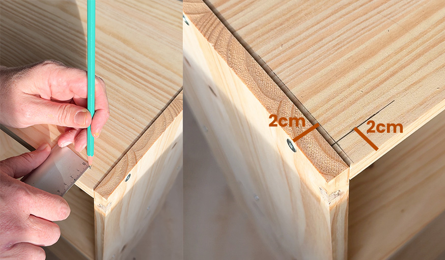 1. Placez l'étagère à l'horizontale sur 2 tasseaux pour la surélever légèrement et travailler plus facilement. Marquez un repère à chaque angle en traçant une droite à 2 cm de chaque bord, comme sur la photo.