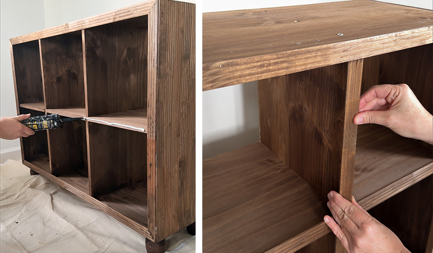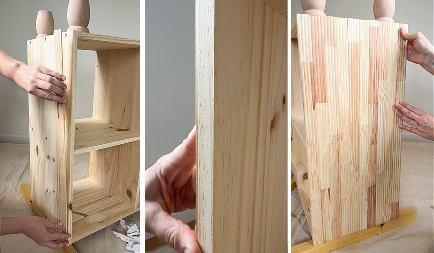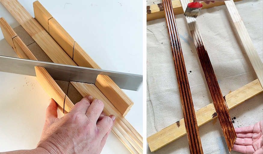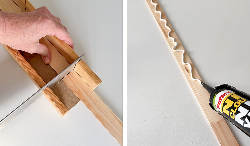 10. Collez ensuite des sections de moulures sur les chants avant intérieurs du meuble, après avoir préalablement pris les mesures et avoir découpé et teinté les sections au brou de noix. Ici, les découpes réalisées à la scie sont donc des découpes droites.
