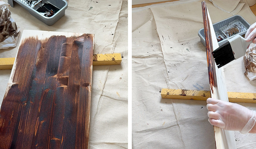 12. Teintez au brou de noix le dessus du plateau, mais aussi les chants et une bande de quelques centimètres sur le dessous. Laissez sécher.