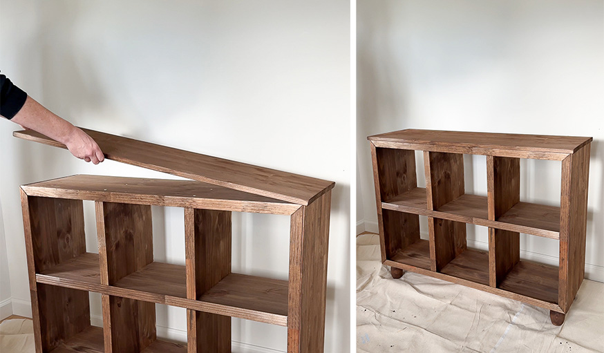 13. Pour finir, collez le plateau sur le dessus du meuble, en alignant le bord arrière avec celui de la Mixxit et en le faisant dépasser de façon égale de chaque côté.