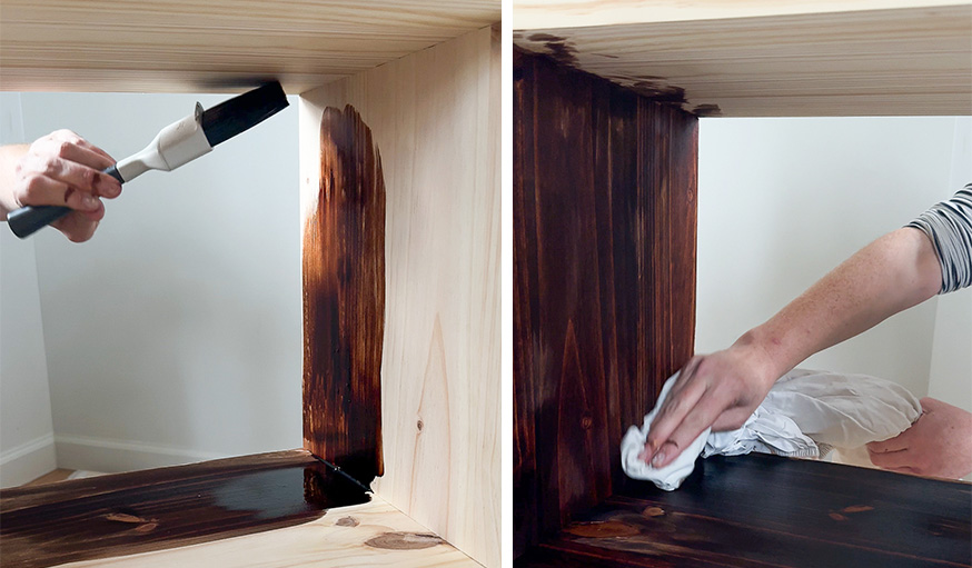6 Diluez très légèrement le brou de noix avec de l'eau, et appliquez votre mélange sur l'ensemble du meuble à l'aide du pinceau plat. Passez ensuite sans attendre un chiffon sur les surfaces pour un rendu uniforme et sans traces. Laissez sécher.