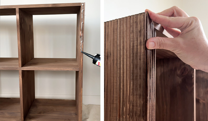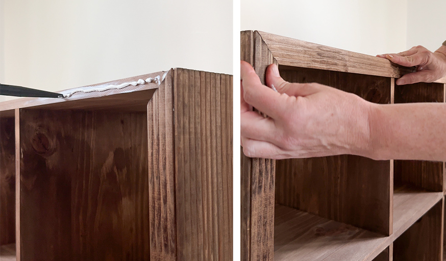 8. Déposez un cordon de colle sur un chant extérieur vertical du devant du meuble. Collez ensuite une section de moulure verticale, bord long vers l'extérieur, en l'alignant comme sur la photo.