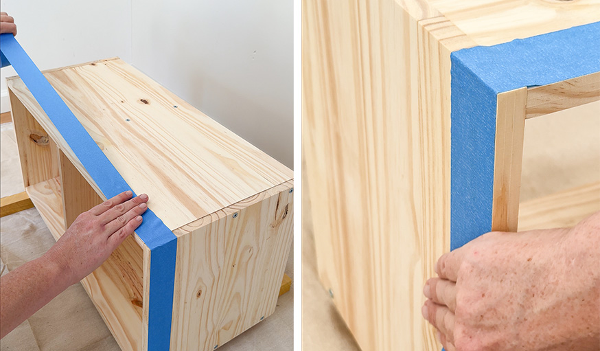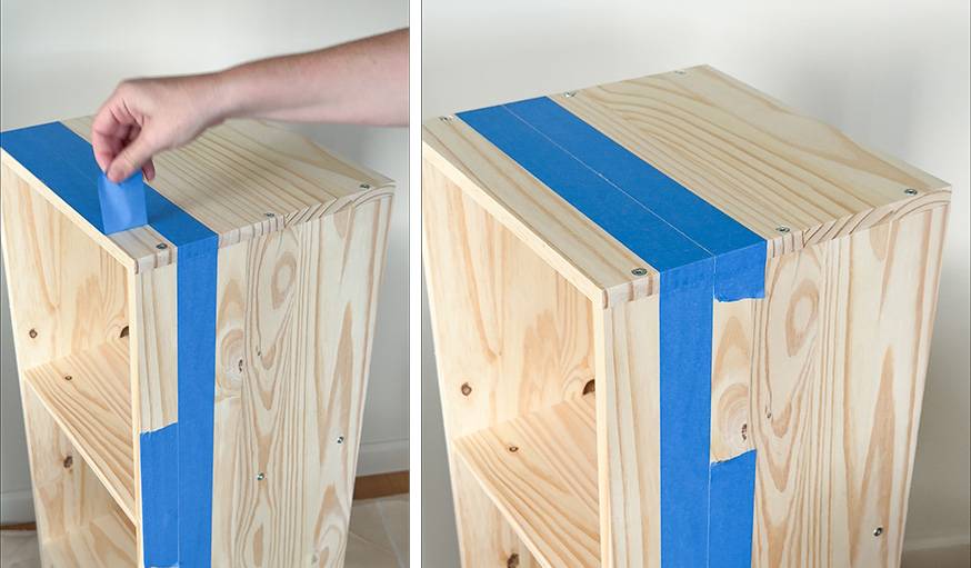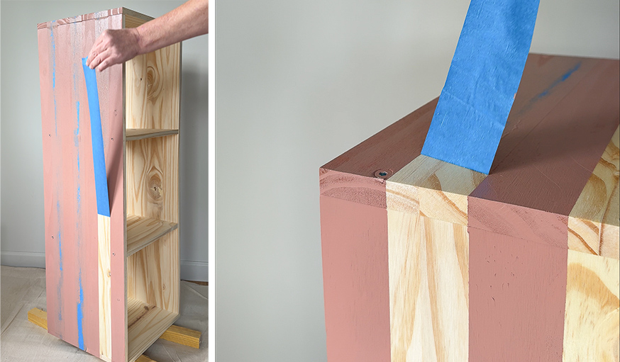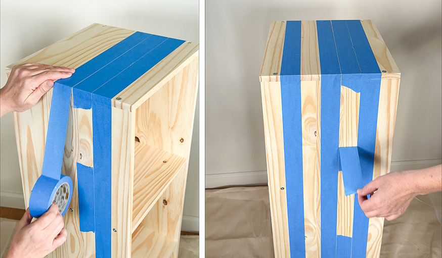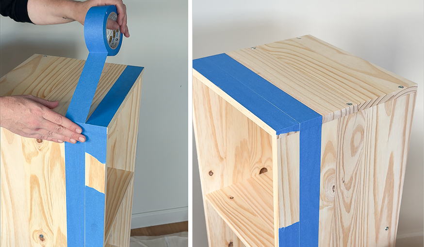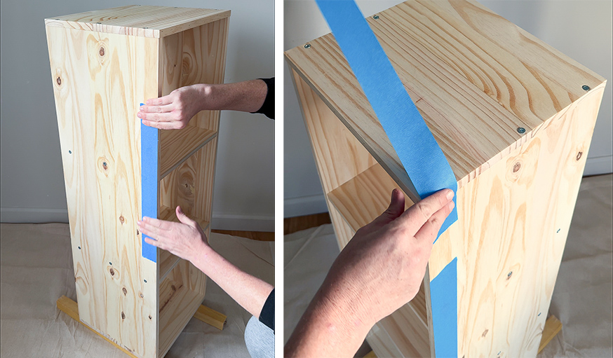 1.Placez l'étagère à la verticale sur 2 tasseaux pour la surélever légèrement et travailler plus facilement. Collez des sections de scotch de masquage sur le dessus et les côtés, en alignant leurs bords avec celui de l'étagère. Ces sections vous serviront de repères.
