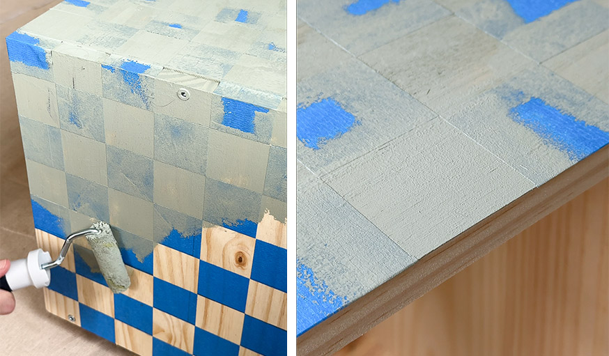 10. À l'aide d'un rouleau, peignez les carrés apparents en 2 couches fines de vert kaki. Ne peignez pas les chants de la face avant du meuble. Pour cela, essorez bien votre rouleau au préalable et passez délicatement sur le bord du dessus du meuble.