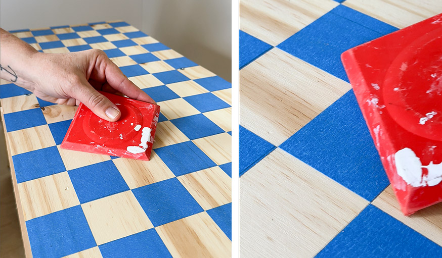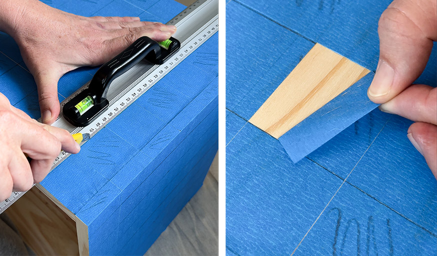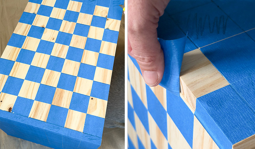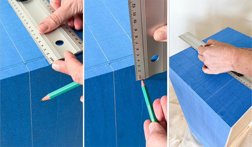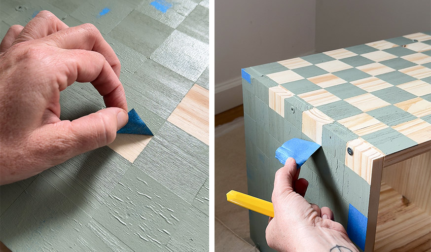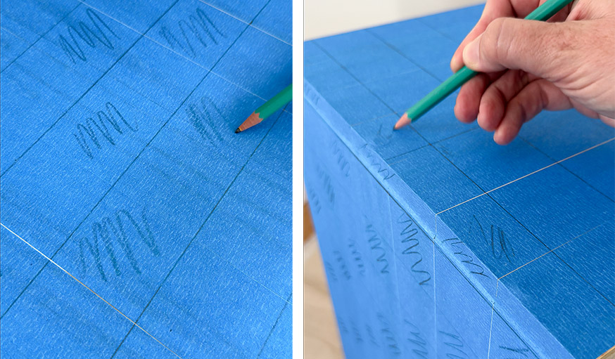 6. On obtient un quadrillage réalisé par les bandes de scotch et les droites perpendiculaires à celui-ci. À l'aide d'un crayon, marquez un carreau sur 2, comme sur la photo, pour réaliser un damier. Aux angles, les carrés sont donc à cheval sur le dessus et le côté du meuble.