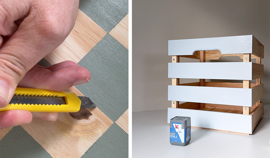 12. Pour finir, grattez délicatement les imperfections des carrés peints avec la pointe d'un cutter en cas d'irrégularité. Peignez les lattes de la face avant de la caisse en bois en bleu feutré.