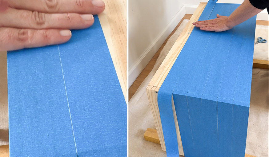 1. Placez l'étagère à l'horizontale sur 2 tasseaux pour la surélever légèrement et travailler plus facilement. Collez une première bande de scotch de masquage sur le dessus et les côtés. Prenez soin d'aligner parfaitement le bord de la bande de scotch avec le bord de l'étagère, comme sur la photo.