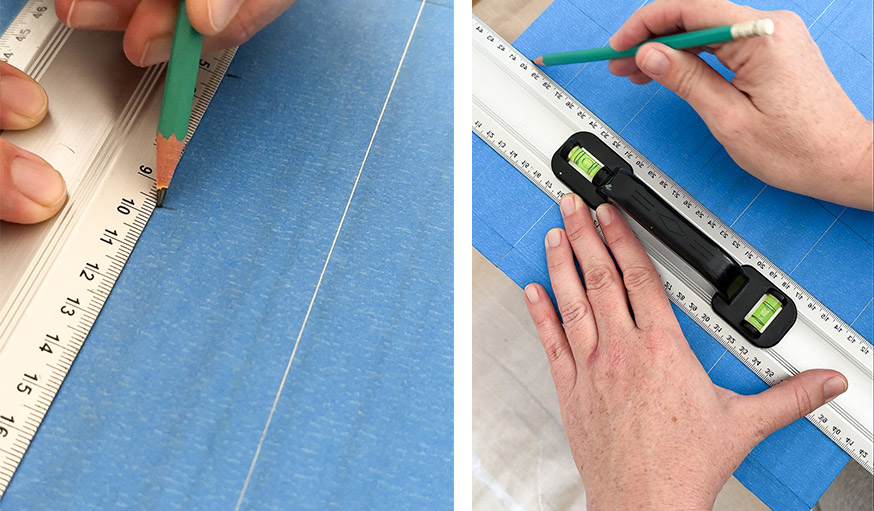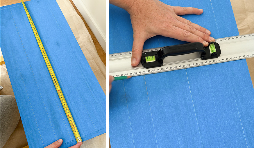 2. Collez ensuite une bande continue de scotch de masquage derrière ces repères, en alignant les bords, comme sur la photo.