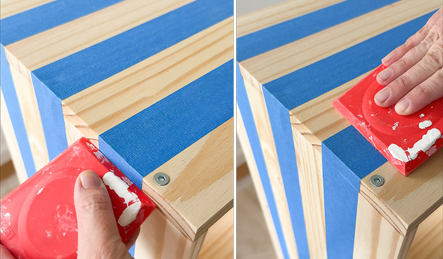5. À l'aide d'une spatule en caoutchouc ou d'une carte de fidélité par exemple, marouflez les bandes de scotch afin de les plaquer de façon uniforme sur la surface.