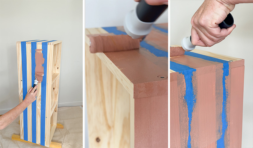 6. Peignez ensuite les zones laissées apparentes sur le dessus et les côtés de l'étagère en appliquant la peinture terracotta avec un petit rouleau en 2 couches. Ne peignez pas les chants à l'avant et l'arrière du meuble. Pour cela, essorez votre rouleau et appliquez doucement la peinture en le plaquant bien contre les parties à peindre, comme sur la photo.