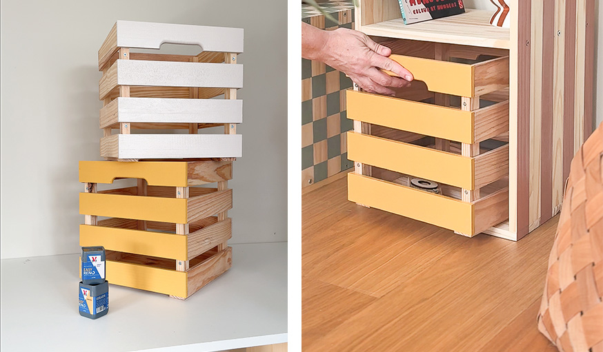 8. Pour terminer, peignez les lattes de la façade avant de chaque caisse en bois, en rose granit pour l'une et jaune miel pour l'autre. Laissez sécher et installez les caisses dans les cases de l'étagère.