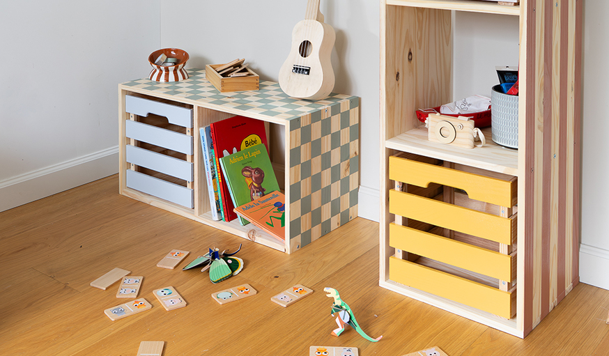 DIY - Rayures vitaminées ou damier tendance : l'étagère Mixxit se métamorphose en rangement ludique pour les enfants. Un DIY facile, économique et parfait pour organiser leurs trésors tout en apportant du style.