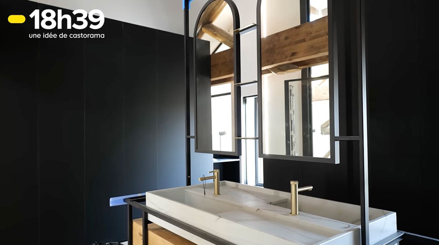 "On a cassé les codes. Normalement on met les vasques à côté de la baignoire sauf que là, la baignoire se trouve de l'autre côté et niveau surface c'était compliqué d'intégrer des lavabos". Résultat, ils optimisent l'espace en intégrant au centre du dressing, les vasques et rangements.