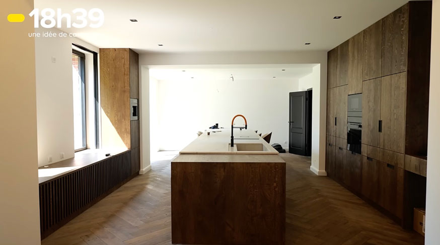 La maison d'origine était composée de nombreuses cloisons. Quentin explique : "C'était des maisons comme à l'époque, où il y avait beaucoup de cloisons, je pense que c'était plus facile pour eux de chauffer". Ils décident donc de tout ouvrir pour créer un vaste espace regroupant entrée, salle à manger et cuisine. Cette dernière est entièrement repensée. "La cuisine d'avant, c'était peut-être la moitié de celle-ci", se souvient le jeune homme. En avançant dans ce qui était autrefois le garage, ils gagnent en surface, en rangements et en convivialité.