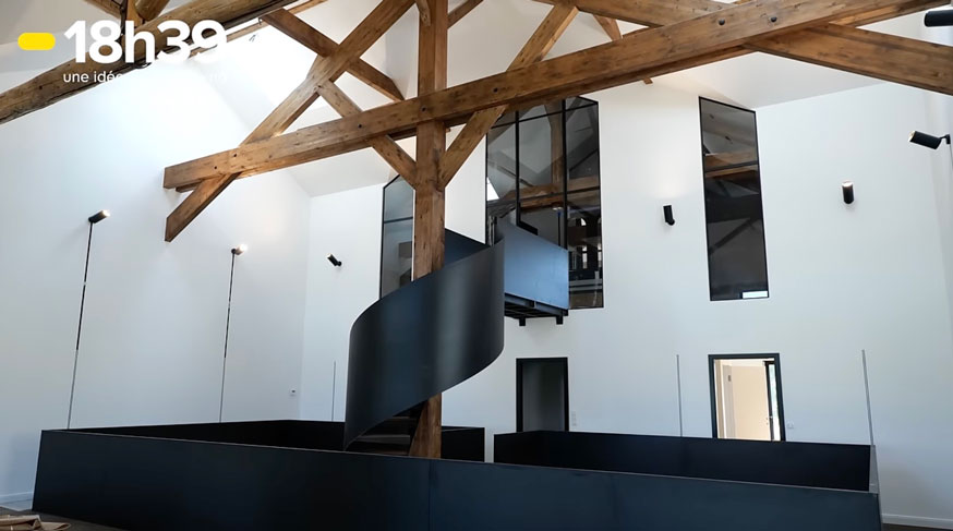Impossible de manquer l'imposant escalier hélicoïdal en acier qui s'élève vers les étages et que l'on aperçoit dès l'entrée. "On a fait appel à une architecte, à la base il y avait deux paliers complets sur deux étages, on voulait quand même optimiser un maximum de hauteur et justement c'est ce qu'on recherchait dans des corps de ferme comme ça, c'est d'avoir de la hauteur", explique Quentin.