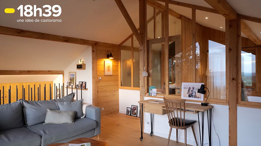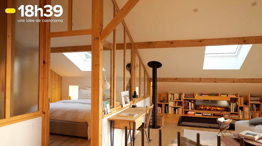 L'étage a lui aussi été totalement repensé. Là où les anciens propriétaires avaient installé un espace salle de jeu, télé et un coin bar, Max et Elisa créent une suite parentale traversante modernisée. Pour ne pas perdre la clarté, ils ajoutent une verrière qui structure l'espace tout en laissant circuler la lumière.