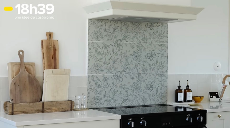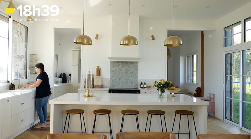 Dans la cuisine, Marine assume un univers très marqué. "J'aime beaucoup le principe farmhouse, un petit peu style américain, et à la fois le côté cottage". Tout est pensé pour laisser entrer la lumière : "je voulais une cuisine très claire, de la pierre, des matériaux bruts". L'élément central ? Le bandeau carrelé sous la hotte. "J'ai eu un coup de cœur pour ce carrelage, à la base un carrelage de salle de bains. Quand je l'ai vu, je me suis dit : où est-ce que je vais pouvoir le mettre dans ma maison ?". Un détail graphique qui capte immédiatement le regard dans cet espace volontairement épuré.