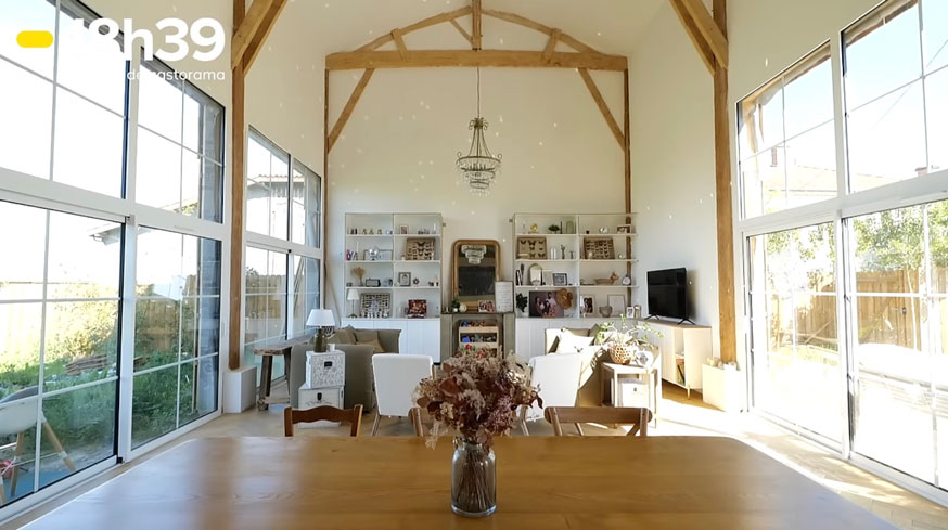 Dans l'ancienne enveloppe agricole, Marine imagine une maison tournée vers l'extérieur. "Je voulais vraiment avoir cette sensation d'être dehors", explique-t-elle. Trois immenses baies vitrées prennent place dans la pièce de vie. Même les jours de pluie, le pari fonctionne : "on n'a pas ce besoin de sortir parce qu'on a l'impression d'être en permanence dehors grâce à ces ouvertures".