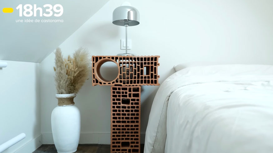 À l'étage, la créativité continue. Chris a conçu ses tables de chevet avec de simples briques à 6€ pièce. Et son lit repose sur un sommier en carton ! "La pièce est petite, et pour y accéder avec un sommier classique, c'était assez compliqué. Ce sommier en carton, il est extensible, il est flexible. Donc facile à transporter et du coup c'était parfait en termes d'installation pour cet espace-là".