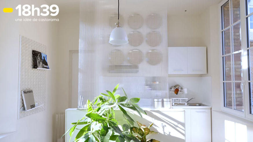 Pour séparer la cuisine du salon, il invente une cloison légère, façon verrière, mais avec une plaque de polycarbonate fixée avec des scratchs, le tout pour une vingtaine d'euros. "Quand j'ai emménagé, c'est vrai que j'aimais beaucoup ce côté openspace. Mais en fait, avec le temps, je me suis dit "Ah, ça me dérange un peu" et je suis tombé sur cette plaque en polycarbonate et les dimensions étaient parfaites", explique-t-il.