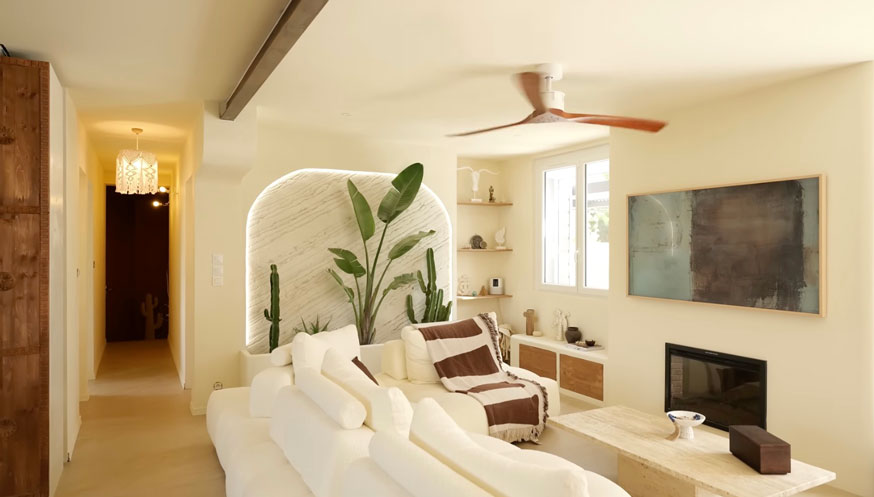 Le résultat est bluffant : des murs clairs, un jeu de textures tout en finesse, et des volumes adoucis par des arrondis, omniprésents dans la maison. Le caisson télé, fabriqué en béton cellulaire, intègre une niche arrondie et un banc pour dissimuler box et câbles. À côté, une grande jardinière intégrée évoque les intérieurs méditerranéens. "Si on peut avoir l'impression d'être en vacances, c'est parfait", s'amuse la jeune femme.