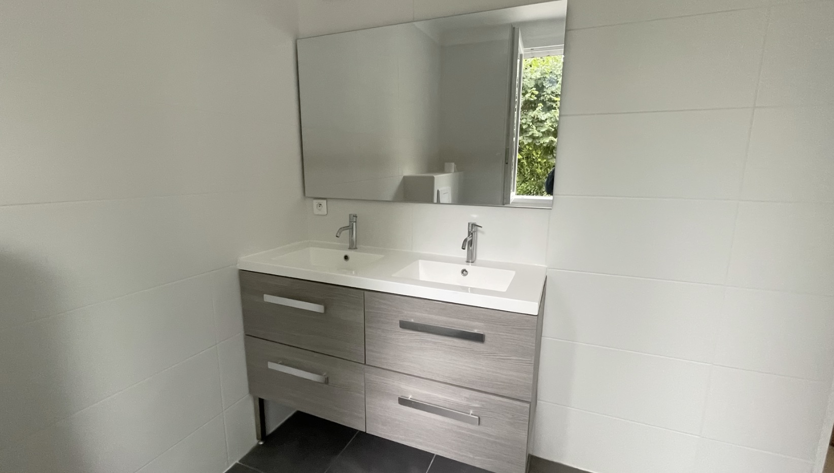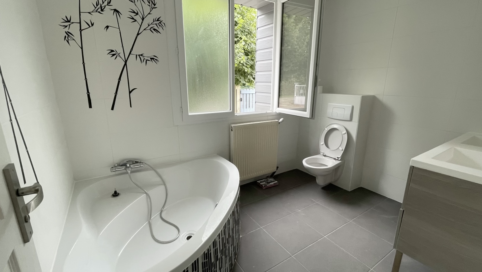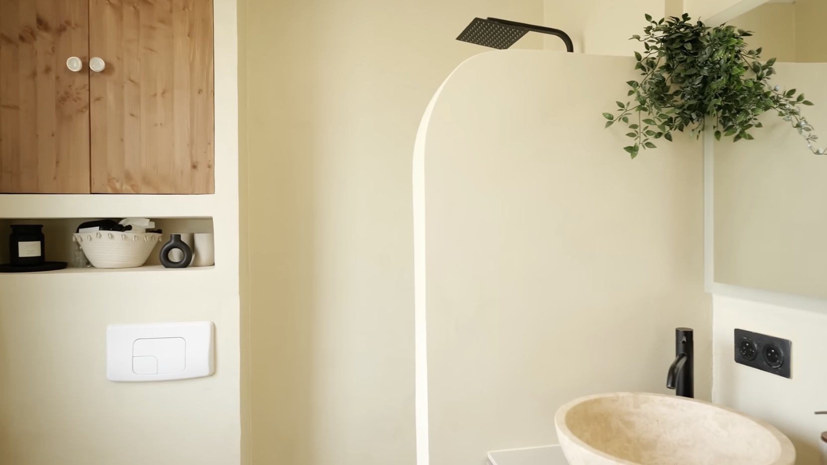 S'il y a une pièce qui résume également leur ingéniosité, c'est bien la salle de bains. "On a utilisé de la colle à carrelage à la place du béton ciré". Une astuce audacieuse et économique (entre 8 et 12 € le mètre carré) qui donne un effet minéral, doux et uniforme, sans joints à entretenir. "C'est notre douche principale, on l'utilise tous les jours, et il n'y a aucun problème. Ça bouge pas", affirme la jeune femme.