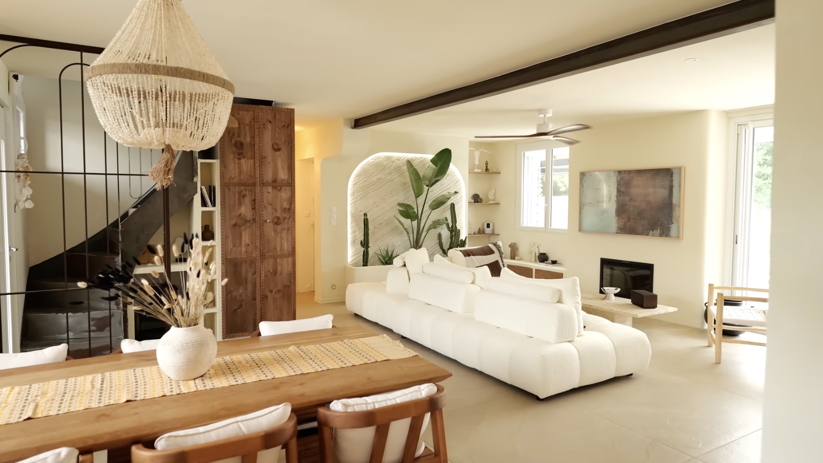 Rapidement, le couple décide alors de tout revoir. Cloisons abattues, volumes réinventés, matériaux repensés. Ce qui était autrefois une chambre devient aujourd'hui une vaste pièce de vie baignée de lumière. "Là où on est assis, c'était une chambre avant. Donc il y a encore cinq mois, notre salon était tout petit, et maintenant on a une vraie belle pièce de vie".
