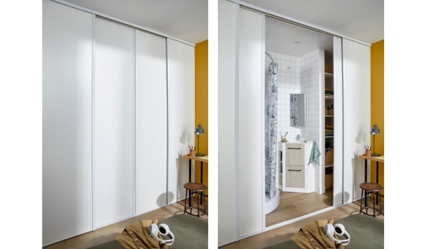 Autre option pour cacher votre salle de bains : l'installer derrière des portes de placard coulissantes. Qu'elles soient opaques ou de style verrière mais floutées, une fois fermées, celles-ci pourront dissimuler une petite pièce d'eau bien pratique ! Dans un espace restreint, privilégiez un meuble vasque d'angle ou un lave-mains gain de place.